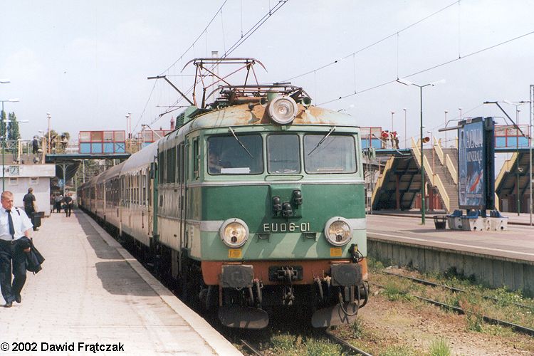 EU06-01 w Szczecinie Głównym, z pociągiem ekspresowym „Barbakan” ze Świnoujścia do Krakowa (06.07.2002). Fot.: Dawid Frątczak.