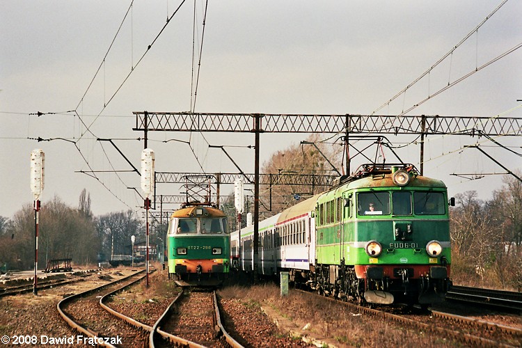 EU06-01 z pociągiem IC 73000 „Wawel” do Krakowa Głównego mija stację Wrocław Leśnica (09.03.2008). Fot.: Dawid Frątczak.