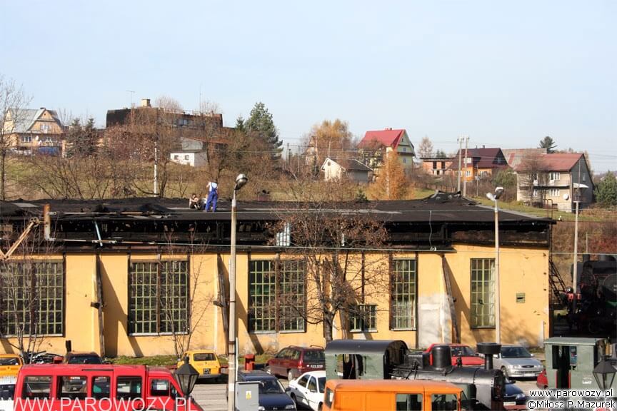 Fotografie przedstawiają prace remontowe w Skansenie: remont dachu hali napraw połączony z wymianą więźby oraz remont torów trakcyjnych.